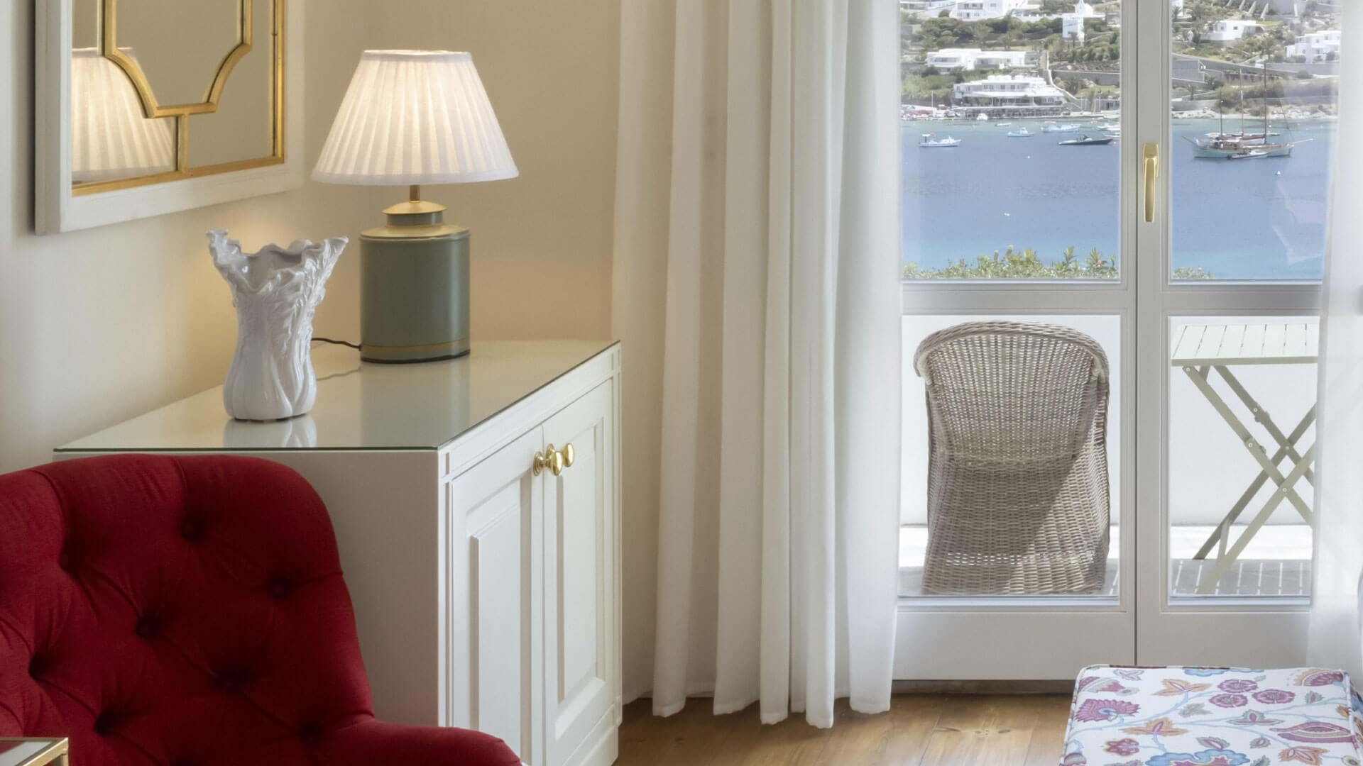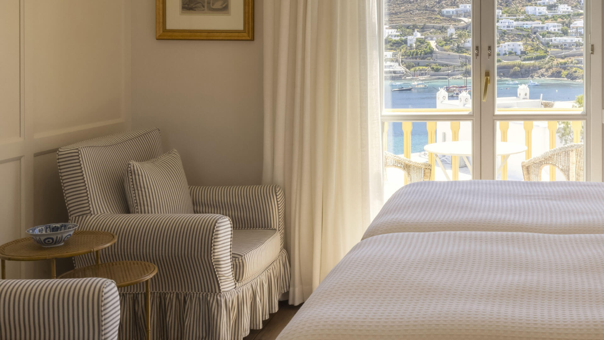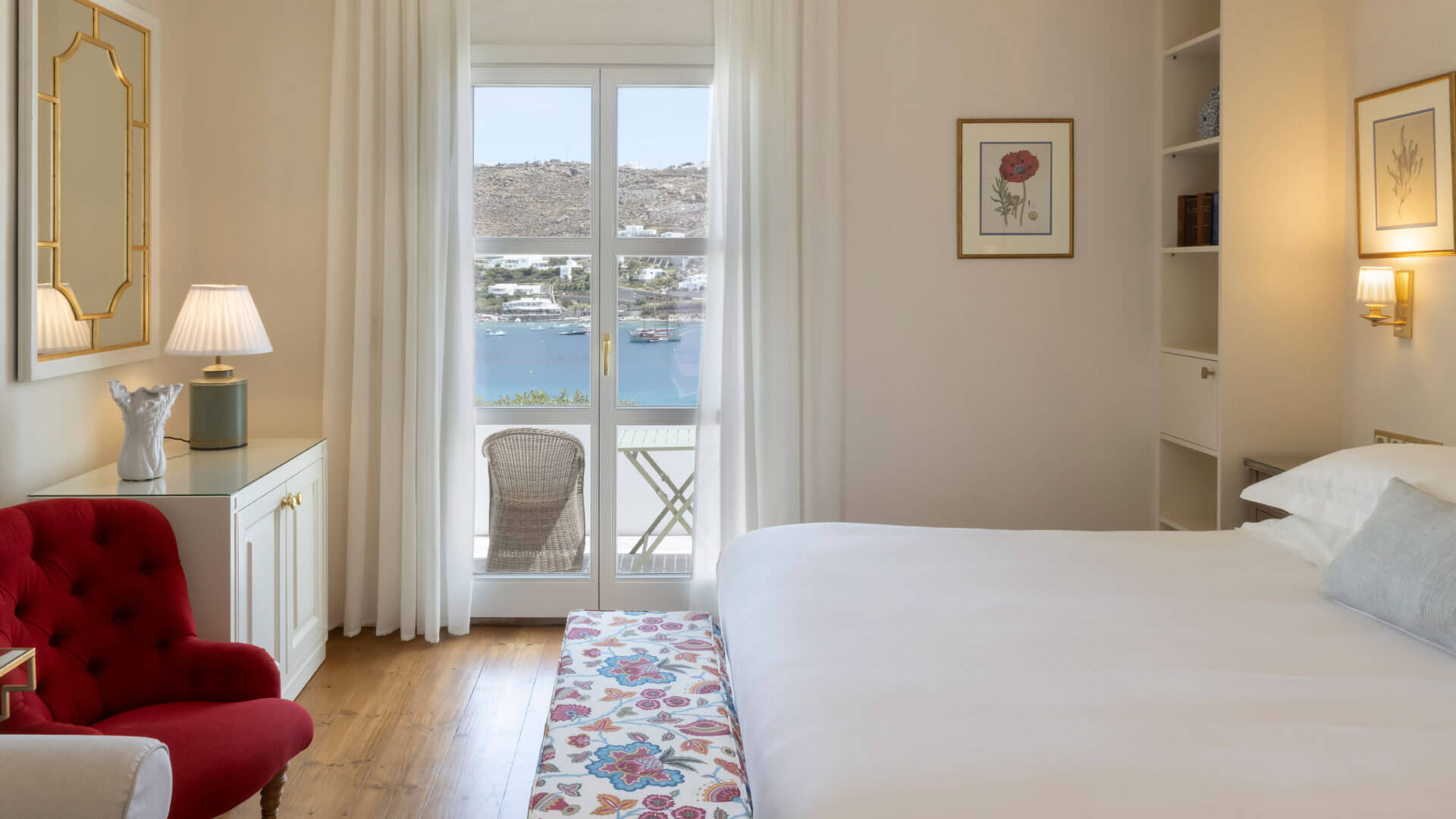 Αυτό το κομψό δωμάτιο αποτελεί αντιπροσωπευτικό δείγμα κυκλαδίτικης αρχιτεκτονικής και είναι διακοσμημένο με κομψές πινελιές από floral μοτίβα, κλασικά αλλά και μοντέρνα χειροποίητα αντικείμενα και πίνακες που προτρέπουν τους επισκέπτες να χαλαρώσουν και να ξεκουραστούν. Το δωμάτιο διαθέτει επίσης ένα όμορφο και ευρύχωρο μαρμάρινο μπάνιο με μπανιέρα και προϊόντα περιποίησης, καθώς και μια όμορφη βεράντα με άνετα έπιπλα εξωτερικού χώρου και μαγευτική θέα στην θάλασσα που κόβει την ανάσα.