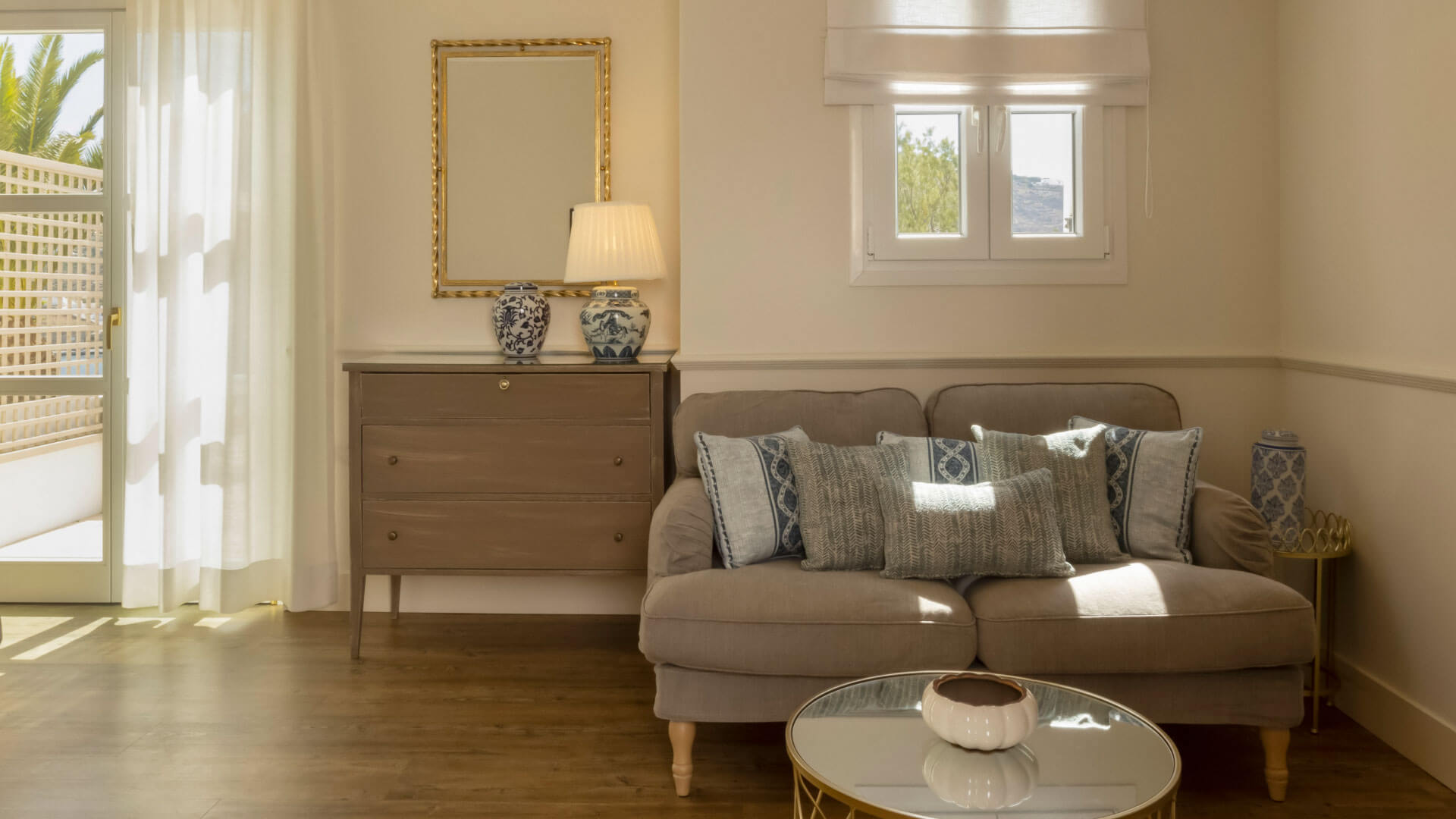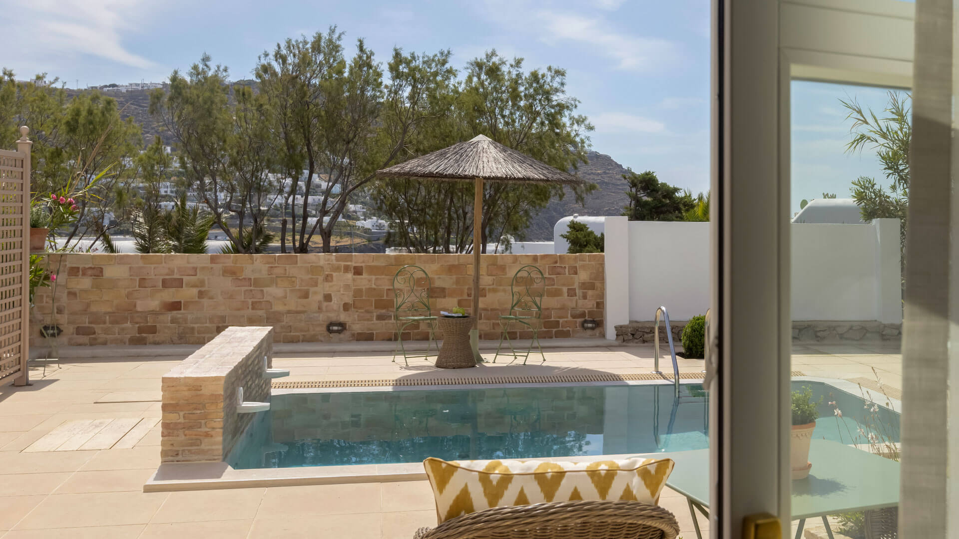 Enjoy the soothing lighting and sensuous atmosphere of our Junior Suite and dive into the refreshing Private Pool. Our Junior Suites are open plan spacious rooms, carefully designed and decorated with an ideal amalgamation of comfort and warmth that enable guests to unwind during their holidays in Mykonos. The Junior Suites with Private Pool also host a large terrace overlooking Ornos beach.